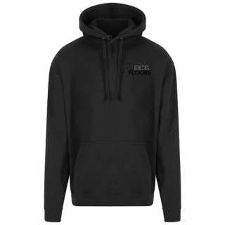 Excel Flooring hoodie with logo embroidered onto the left chest and website on the back.