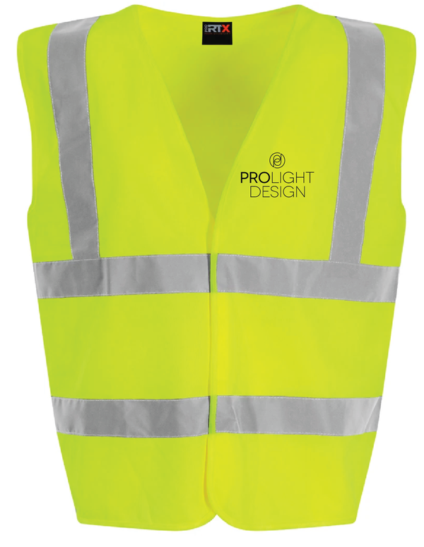 Prolight Design High Vis Vest with left chest print and back print of black version of the logo.